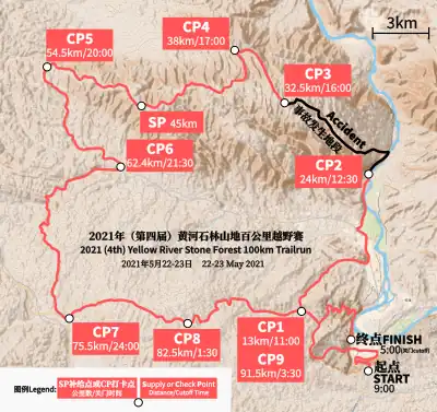 Le Yellow River Stone Forest Mountain Marathon est une compétition de trail organisée chaque année depuis 2018, à partir de la zone pittoresque de la forêt de pierre du fleuve Jaune. L'édition 2021 se composait de trois épreuves : 5 km de course à pied, un semi-marathon en nature et un ultramarathon de 100 km. Les participants à la course de 100 km devaient donner la preuve qu'ils avaient terminé une course similaire de plus de 50 km au cours de la dernière année et être âgés de 18 à 60 ans.