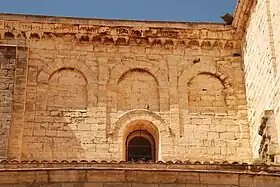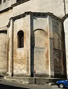 L'abside principale, voûtée en cul-de-four, présente un décor fait de cinq arcades aveugles avec colonnettes cannelées ou torsadées surmontées de chapiteaux à feuilles d'acanthe.