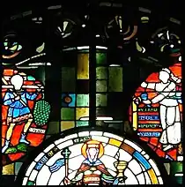 Parmi les vitraux on remarquera : Une crucifixion entourée de figures symbolique et de figures de l'Ancien Testament formant un vitrail de la Rédemption (inspirée de l'art mosan) du milieu du XIIe siècle : elle est en neuf panneaux et fait 1,78 sur m, le vitrail a été retravaillé après l'incendie de 1230 pour s'adapter aux fenêtres de la nouvelle église gothique.
