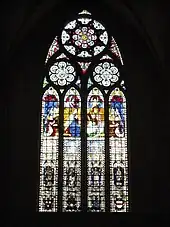 Le chœur fut orné de vitraux commandés par l'évêque Roger de Mercy en 1235, ces vitraux représentent des scènes bibliques ou de la vie de saint et furent déplacés dans les absidioles attenantes au chœur au XIXe siècle à la suite de la conception de nouveaux vitraux par Casimir de Balthazar de Gachéo. Ce dernier composa de beaux vitraux pour habiller les trois fenêtres à doubles lancettes de 26 mètres de haut éclairant le chœur : dans un style historiciste, l'artiste présente 14 scènes de la vie du Christ dans la verrière centrale ; des scènes de l'Ancien Testament dans celle de gauche ; des épisodes clefs de la vie de l'Église dans cette de droite.