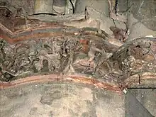 • Une peinture très effacée sur le mur du croisillon nord du transept roman (juste derrière la porte d'entrée située au nord).