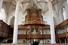 L'édifice prend son aspect actuel autour de 1430. L'église-halle de style gothique tardif est prolongée au sud d'une quatrième nef. L'intérieur est redécoré dans le goût baroque, après l'incendie de la ville en 1634 qui atteint aussi l'église. Le clocher est rehaussé d'une flèche baroque en 1664. L'édifice est plusieurs fois restauré, la dernière fois en 1987, et ses façades ont été récemment nettoyées.