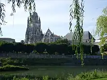 Exception faite du clocher, l'édifice est presque achevé lorsque éclatent les guerres de religion. En 1568, les troupes huguenotes conduites par François de Coligny d'Andelot saccagent la cathédrale, martelant le portail et brisant en deux la statue de Charlemagne située à droite de celui-ci. De même, une partie des chapelles rayonnantes du chœur sont détruites ou mutilées et le mobilier est pillé. Après quoi, ordre est donné de saper les piliers de la nef, provoquant son effondrement.