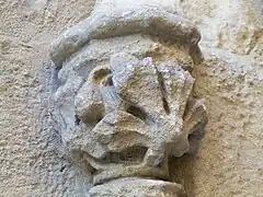 L'entrée actuelle est flanquée de deux colonnes à fûts lisses couronnées de chapiteaux composites où se retrouvent des feuilles d'acanthe et des volutes. Elle est surmontée d'un entablement à deux niveaux, l'architrave étant sommée d'une corniche à denticules. Deux pots à feu encadrent une niche à fronton triangulaire. À droite du portail, une baie gothique éclaire la nef romane une croix datée de 1805 dont le Christ fut fondu ultérieurement par les hauts-fourneaux de Rustrel, en 1851[42].