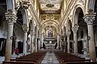 L'intérieur possède trois nefs avec une structure en croix latine. Des chapelles latérales possèdent quelques œuvres intéressantes comme Le Jugement Dernier, une fresque médiévale ou encore la statue de la Madonne della Bruna, sainte patronne de la ville. On trouve également de belles figurines polychromes dans une crèche en pierre[1].