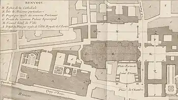 Mais aucun projet ne se construit. L’architecte Jacques-François Blondel, protégé par le duc de Choiseul, alors présent à Metz pour reconstruire l’abbaye Saint-Louis dont sa oeur est abbesse, va opportunément proposer de réaliser un projet d’aménagement qui comprend la création de rues et de places, ainsi que la reconstruction de l’hôtel de ville, du parlement et du palais de l’évêque mais en détruisant le cloître des chanoines et des églises situées autour (églises Saint-Pierre-le-Vieux, Saint-Pierre-aux-Images, Saint-Gorgon et chapelle des Lorrains)[31].