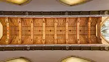Il mesure 32 mètres de long et date du XIVe siècle. La décoration des caissons comporte des thèmes historiques, religieux, et de peinture des mœurs : fonctionnaires, artisans, personnages historiques, créatures fantastiques. Toute une galerie de types humains, une grande variété picturale, ensemble qui a été maintenu en parfait état, car il a été couvert - et protégé - par un faux-plafond néoclassique au XVIIIe siècle.