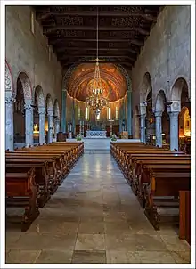 Le plafond à coque de navire de la nef principale date certainement du XIVe siècle. En 1423, l'abside est décorée de fresques par Domenico Lu Domine et Antonio Baietto, artistes frioulans. En 1843, elle est agrandie en détruisant la fresque du Couronnement de la Vierge dont certains fragments sont parfois exposés dans le château, et remplacée par une voûte néoclassique à caissons. Dans les premières décennies du XXe siècle, le plafond est démoli et reconstruit ; le décor à caissons est remplacé par une mosaïque proposant le thème du Couronnement de la Vierge, choisi après un concours sur ce thème.