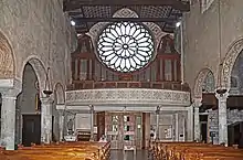 Depuis 2012, l'orgue dispose de trois claviers de 58 notes chacun et d'un pédalier concave-radiale de 30. La caisse en bois néoclassique qui encadre la rosace est celle d'origine.