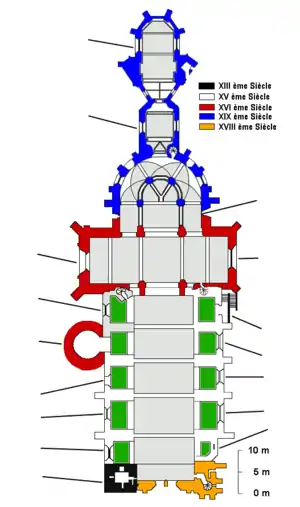 De style gothique, elle est élevée sur le site de l'ancienne cathédrale romane. Sa construction s'étend sur cinq siècles, du XVe au XIXe siècle, et si l'on inclut la durée d'existence de la tour-clocher romane conservée de l'ancien édifice, on arrive à une durée de construction de sept siècles. Dans son ensemble, l'édifice reste, malgré tout, fidèle à l'ancienne romane et comprend une nef accompagnée de dix chapelles latérales, un transept à bras inégaux, un chœur enveloppé d'un déambulatoire et en enfilade deux chapelles axiales.