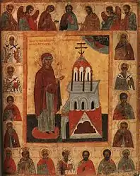 - Icône de la Déposition-de-la-robe-de-la-Vierge. Milieu du XVIe siècle. Icône russe de l'école de Novgorod. Doska, pavoloka, levkas, tempera. 46 × 38 cm. Marie se tient debout devant la châsse de l'église Sainte-Marie-des-Blachernes en tendant ses mains vers elle. Dans la châsse se trouve la robe de la Vierge. Dans le coin supérieur droit apparaît la main de Dieu (en) tendue. Dans la polé supérieure est représentée une déisis composée de 7 figures : Pierre apôtre, saint Michel, Notre-Dame, Jésus-Christ, Jean le Baptiste, l'archange Gabriel, saint Paul.