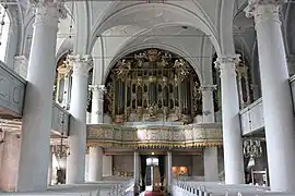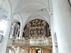 La cathédrale a un autel de 13 mètres de haut, un confessionnal, une chaire, au deuxième étage se trouve la loge des ducs de Courlande. La cathédrale se distingue particulièrement par son orgue à 131 jeux, 4 claviers et plus de 7 000 tuyaux, ce qui en fait le plus grand orgue mécanique du monde jusqu'en 19681968[2]. C'était le premier grand orgue mécanique en Lettonie et il a été fabriqué par Heinrich Andreas Contius en 1779[3],[4],[5].