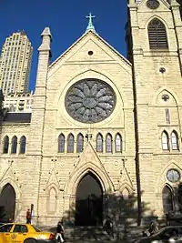 Deux portes en bronze constituent le principal accès à l'édifice. Pesant chacune près de 2 tonnes, elles sont actionnées par un système hydraulique permettant leur ouverture par une simple pression de la main. Elles sont l'œuvre de l'artiste Albert J. Friscia[9]. La façade est ornée d'une rosace à douze pétales ornée de vitraux contemporains aux teintes azur. De part et d'autre de la façade devaient se trouver deux tours, dont une seule a effectivement été construite. Celle-ci est couronnée par une flèche octogonale en ardoise.
