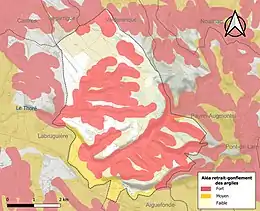 La commune est vulnérable au risque de mouvements de terrains constitué principalement du retrait-gonflement des sols argileux[30]. Cet aléa est susceptible d'engendrer des dommages importants aux bâtiments en cas d’alternance de périodes de sécheresse et de pluie. 61 % de la superficie communale est en aléa moyen ou fort (76,3 % au niveau départemental et 48,5 % au niveau national). Sur les 142 bâtiments dénombrés sur la commune en 2019, 95 sont en aléa moyen ou fort, soit 67 %, à comparer aux 90 % au niveau départemental et 54 % au niveau national. Une cartographie de l'exposition du territoire national au retrait gonflement des sols argileux est disponible sur le site du BRGM[31],[Carte 3].