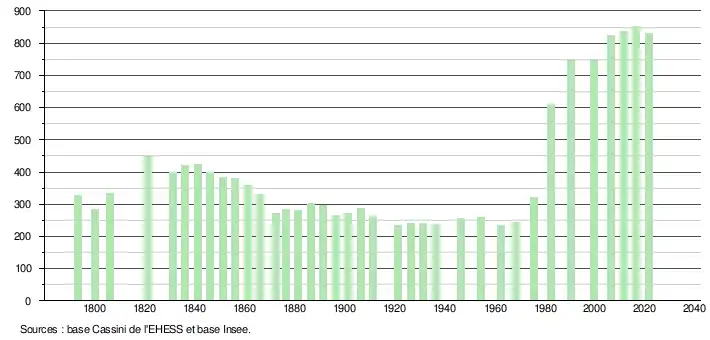 L'évolution du nombre d'habitants est connue à travers les recensements de la population effectués dans la commune depuis 1793. Pour les communes de moins de 10 000 habitants, une enquête de recensement portant sur toute la population est réalisée tous les cinq ans, les populations légales des années intermédiaires étant quant à elles estimées par interpolation ou extrapolation[24]. Pour la commune, le premier recensement exhaustif entrant dans le cadre du nouveau dispositif a été réalisé en 2006[25].