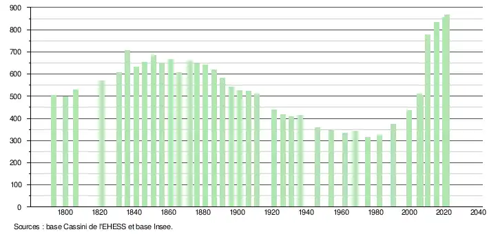 | L'évolution du nombre d'habitants est connue à travers les recensements de la population effectués dans la commune depuis 1793. Pour les communes de moins de 10 000 habitants, une enquête de recensement portant sur toute la population est réalisée tous les cinq ans, les populations légales des années intermédiaires étant quant à elles estimées par interpolation ou extrapolation[31]. Pour la commune, le premier recensement exhaustif entrant dans le cadre du nouveau dispositif a été réalisé en 2005[32]. En 2021, la commune comptait 866 habitants[Note 5], en augmentation de 3,96 % par rapport à 2015 (Haute-Garonne : +7,43 %, France hors Mayotte : +1,84 %). |