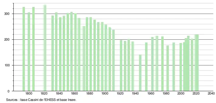 L'évolution du nombre d'habitants est connue à travers les recensements de la population effectués dans la commune depuis 1793. Pour les communes de moins de 10 000 habitants, une enquête de recensement portant sur toute la population est réalisée tous les cinq ans, les populations légales des années intermédiaires étant quant à elles estimées par interpolation ou extrapolation[27]. Pour la commune, le premier recensement exhaustif entrant dans le cadre du nouveau dispositif a été réalisé en 2004[28].