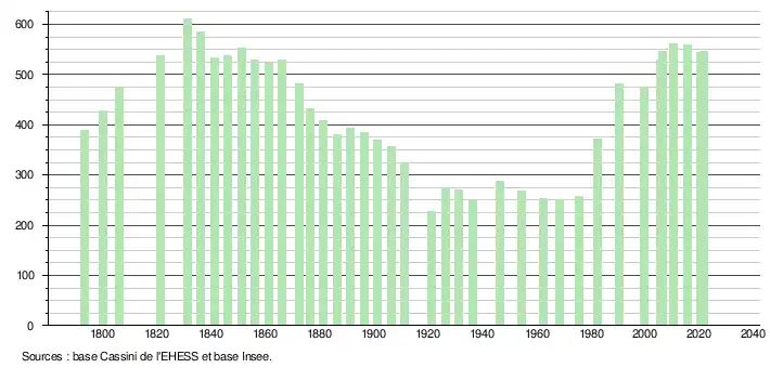 L'évolution du nombre d'habitants est connue à travers les recensements de la population effectués dans la commune depuis 1793. Pour les communes de moins de 10 000 habitants, une enquête de recensement portant sur toute la population est réalisée tous les cinq ans, les populations légales des années intermédiaires étant quant à elles estimées par interpolation ou extrapolation[23]. Pour la commune, le premier recensement exhaustif entrant dans le cadre du nouveau dispositif a été réalisé en 2005[24].