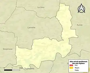 Le retrait-gonflement des sols argileux est susceptible d'engendrer des dommages importants aux bâtiments en cas d’alternance de périodes de sécheresse et de pluie. Aucune partie du territoire de la commune n'est en aléa moyen ou fort (19,2 % au niveau départemental et 48,5 % au niveau national). Sur les 205 bâtiments dénombrés sur la commune en 2019, aucun n'est en aléa moyen ou fort, à comparer aux 17 % au niveau départemental et 54 % au niveau national. Une cartographie de l'exposition du territoire national au retrait gonflement des sols argileux est disponible sur le site du BRGM[21],[Carte 2].