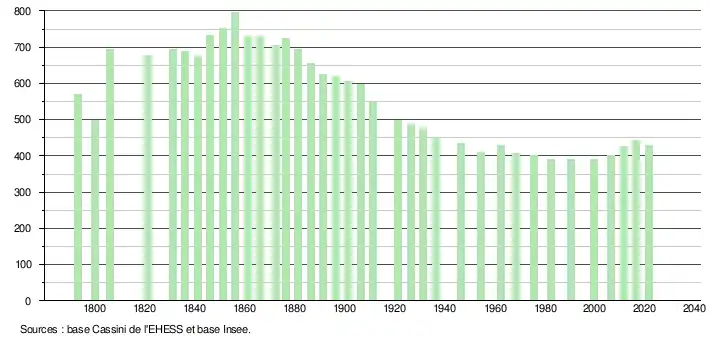 L'évolution du nombre d'habitants est connue à travers les recensements de la population effectués dans la commune depuis 1793. Pour les communes de moins de 10 000 habitants, une enquête de recensement portant sur toute la population est réalisée tous les cinq ans, les populations légales des années intermédiaires étant quant à elles estimées par interpolation ou extrapolation[23]. Pour la commune, le premier recensement exhaustif entrant dans le cadre du nouveau dispositif a été réalisé en 2006[24].
