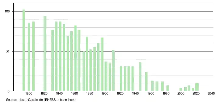 L'évolution du nombre d'habitants est connue à travers les recensements de la population effectués dans la commune depuis 1793. Pour les communes de moins de 10 000 habitants, une enquête de recensement portant sur toute la population est réalisée tous les cinq ans, les populations légales des années intermédiaires étant quant à elles estimées par interpolation ou extrapolation[30]. Pour la commune, le premier recensement exhaustif entrant dans le cadre du nouveau dispositif a été réalisé en 2005[31].