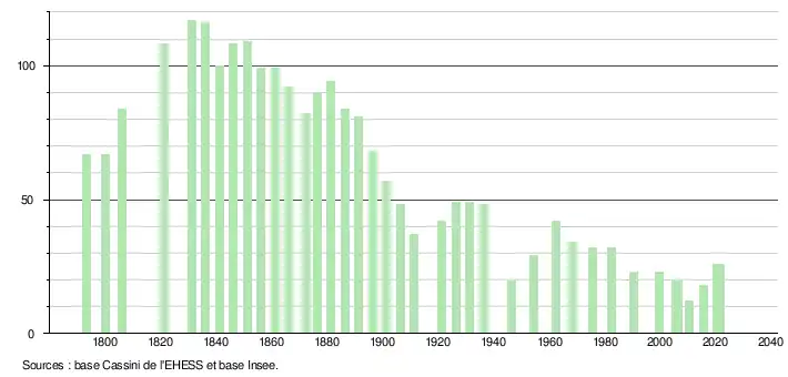 L'évolution du nombre d'habitants est connue à travers les recensements de la population effectués dans la commune depuis 1793. Pour les communes de moins de 10 000 habitants, une enquête de recensement portant sur toute la population est réalisée tous les cinq ans, les populations légales des années intermédiaires étant quant à elles estimées par interpolation ou extrapolation[28]. Pour la commune, le premier recensement exhaustif entrant dans le cadre du nouveau dispositif a été réalisé en 2005[29].