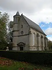 - L'intérieur comporte trois travées droites et une abside à pans coupés, l'ensemble étant voûté d'ogives avec liernes et tiercerons, et les clés de voûte pendantes sont richement décorées. Comme particularité, les culots sur lesquels retombent les nervures des voûtes représentent des aigles aux ailes déployées dans la nef, et des anges tenant des banderoles ou des écussons dans le chœur. Sous chaque culot, se trouve une niche à statue au fronton triangulaire. Un petit autel est ménagé dans l'épaisseur du mur du chœur, bénéficiant lui aussi d'une décoration d'un grand raffinement. La chapelle est toujours restée propriété privée. Entre 1661 et 1712, trois messes y sont dites chaque semaine par un chapelain, grâce à une fondation par Anne du Fay, dame de Châteaurouge. La chapelle est désaffectée au culte à la Révolution, et le culte n'y est rétabli que pour une courte durée en 1862[44],[45]. Propriété privée, elle est mise en vente en 2019[46]