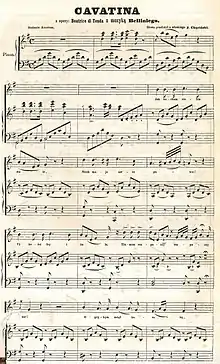 Parmi les cavatines les plus connues : « Casta Diva » dans l'opéra Norma de Vincenzo Bellini (1831), « Salut, demeure chaste et pure » dans Faust de Gounod et « Una voce poco fa » dans Le Barbier de Séville de Rossini.