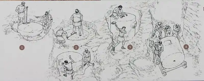 L'opération se poursuivit jusqu'à ce que le tambour ait atteint la hauteur souhaitée (3), après quoi il est extrait, en le détachant du lit de la roche à l'aide de coins métalliques ou en bois dilatés à l'eau.