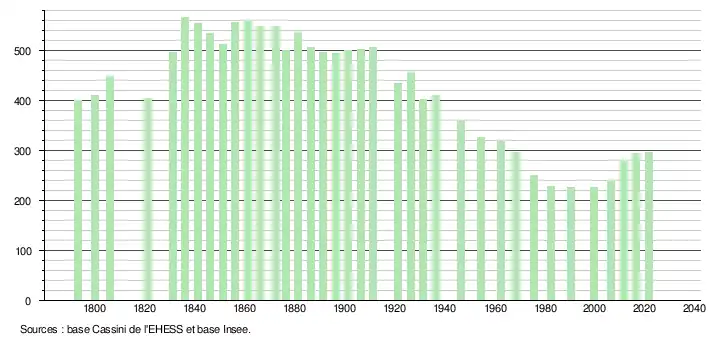 L'évolution du nombre d'habitants est connue à travers les recensements de la population effectués dans la commune depuis 1793. Pour les communes de moins de 10 000 habitants, une enquête de recensement portant sur toute la population est réalisée tous les cinq ans, les populations légales des années intermédiaires étant quant à elles estimées par interpolation ou extrapolation[13]. Pour la commune, le premier recensement exhaustif entrant dans le cadre du nouveau dispositif a été réalisé en 2006[14].