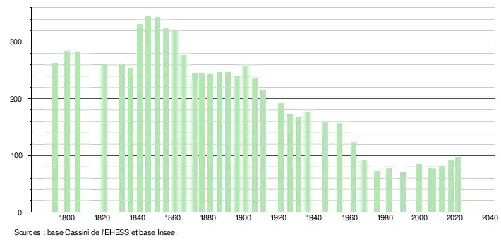 L'évolution du nombre d'habitants est connue à travers les recensements de la population effectués dans la commune depuis 1793. Pour les communes de moins de 10 000 habitants, une enquête de recensement portant sur toute la population est réalisée tous les cinq ans, les populations légales des années intermédiaires étant quant à elles estimées par interpolation ou extrapolation[28]. Pour la commune, le premier recensement exhaustif entrant dans le cadre du nouveau dispositif a été réalisé en 2007[29].