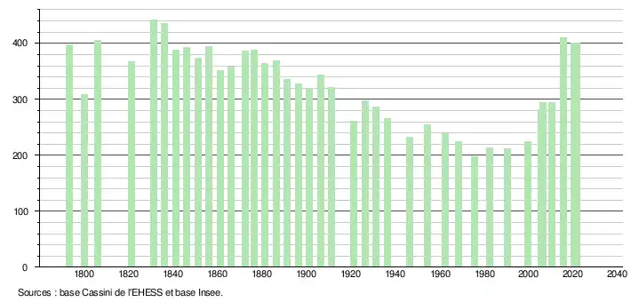 L'évolution du nombre d'habitants est connue à travers les recensements de la population effectués dans la commune depuis 1793. Pour les communes de moins de 10 000 habitants, une enquête de recensement portant sur toute la population est réalisée tous les cinq ans, les populations légales des années intermédiaires étant quant à elles estimées par interpolation ou extrapolation[22]. Pour la commune, le premier recensement exhaustif entrant dans le cadre du nouveau dispositif a été réalisé en 2005[23].