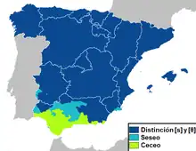- Certains noyaux ceceants existent également, isolés de l'ensemble majoritairement seseant, dans des villages des provinces de Jaén et Cordoue.