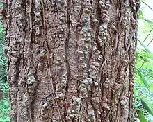 L'acajou amer est un arbre de taille imposante qui peut atteindre 40 m de hauteur. Le tronc pouvant mesurer 1 m de diamètre a une écorce grise et fissurée longitudinalement[1].