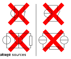 Il est impossible de connecter deux sources de nature identique : on ne peut pas relier directement deux sources de tension ou deux sources de courant. (Voir figure 1). L'une des grandeurs est donc imposée par la source et l'autre par la charge.