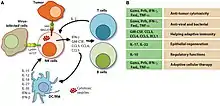 l'IL-15 est unique à cet égard. L'IL-15 interagit avec les cellules T Pour que cela se produise, l'IL-15 soluble se lie à l'IL-15Rα sur la surface des cellules qui présentent ce complexe aux cellules NK exprimant les hétérodimères IL2-Rβ / γc[36]. L'IL-15 peut être présentée par les cellules dendritiques et les macrophages ainsi que par les cellules non hématopoïétiques, y compris les cellules stromales et les cellules épithéliales[37]. IL-21 synergise avec IL-2 pour augmenter l'expression de NKG2A, CD25, CD86, CD69, Perforin et Granzyme B et ainsi augmenter la cytotoxicité[38]. Ces cytokines qui utilisent les récepteurs à base de γc sont le lien obligatoire entre les cellules NK et les cellules qui les produisent. Par exemple, les cellules T auxiliaires qui produisent de l'IL-21 peuvent réguler les niveaux d'expression des récepteurs d'activation ou du contenu cytolytique dans les cellules NK. De même, les CD qui produisent IL-15 jouent un rôle essentiel dans la prolifération et l'amorçage des cellules NK