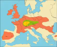Le proto-celtique serait apparu en Europe centrale avec la culture des champs d'urnes de l'Âge du bronze récent, à partir de [6], ou en France, vers le nord des Alpes, antérieurement à 1000 av. J. C., selon des recherches plus récentes[7]. Cependant, selon un consensus se dégageant depuis le XIXe siècle, les premiers peuples à adopter des caractéristiques culturelles considérées comme pleinement celtiques furent ceux de la culture de Hallstatt, en Europe centrale (1200 - ) : Autriche, Suisse, grande moitié sud de l'Allemagne, Bohême, Moravie, ouest de la Hongrie, ouest de la Slovaquie, Galicie, Italie du Nord et Grand Est français[8]. Au cours de la période de La Tène ( jusqu'à la conquête romaine), le territoire de l'Europe celtique s'est étendu par migration vers les régions suivantes : îles Britanniques (Celtes insulaires), moitié ouest de la France (Gaulois transalpins), Grand Sud-Est français (Celto-Ligures), Benelux (Belges), sud de la Plaine du Pô (Gaulois cisalpins), péninsule Ibérique (Celtibères)[9], péninsule cimbrienne et Frise, Pannonie (Scordiques), centre de l'Anatolie (Galates de la Grande Expédition)[10]…