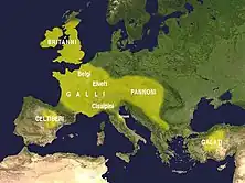 La Gaule, ou Gallia, était le nom romain de la région située entre le Rhin et les Pyrénées. Vers 400 av. J.-C. environ, tous les Gaulois appartenaient à la culture de La Tène. Les Romains s'emparèrent du Sud du pays au cours du IIe siècle, et les contacts avec la Méditerranée « romanisèrent » en partie les Gaulois, avant que Jules César conquière le pays tout entier dans les années 50 av. J.-C.