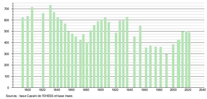 L'évolution du nombre d'habitants est connue à travers les recensements de la population effectués dans la commune depuis 1793. Pour les communes de moins de 10 000 habitants, une enquête de recensement portant sur toute la population est réalisée tous les cinq ans, les populations légales des années intermédiaires étant quant à elles estimées par interpolation ou extrapolation[28]. Pour la commune, le premier recensement exhaustif entrant dans le cadre du nouveau dispositif a été réalisé en 2007[29].