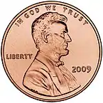 L'avers de la pièce est le même que ceux du Lincoln cent. Il représente le profil droit d'Abraham Lincoln, 16e président des États-Unis avec la légende In god we trust, le mot Liberty et le millésime 2009.