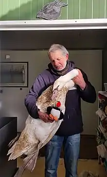Didier Masci, cofondateur de Volée de piafs, le plus grand centre de soin de la faune sauvage de France, avec un cygne prêt à être remis en liberté, en décembre 2018[1],[2].