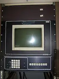 Pupitre de commande, bâtiment principal ; la rangée de boutons rouges servait à positionner les antennes en survie ; à gauche des boutons : 2 anémomètres, pour les antennes (2008). Les 2 boitiers bleus sont des téléphones Inmarsat.