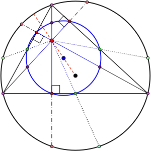 Le centre du cercle d'Euler est le centre des cercles circonscrits de trois triangles liés au triangle de base : son triangle médian, son triangle orthique et son triangle d'Euler (le triangle formé des milieux des segments entre les sommets et l'orthocentre[3]. De façon plus générale, par construction, il est le centre du cercle circonscrit de tout triangle dont les trois sommets sont sur le cercle d'Euler.