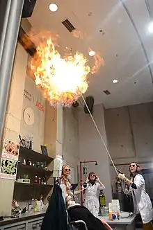 La salle du théâtre des sciences répond aux exigences de sûreté et de sécurité et est conçue pour montrer des explosions, expérimenter avec des gaz et effectuer des démonstrations nécessitant beaucoup d'espace.