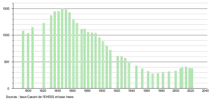 L'évolution du nombre d'habitants est connue à travers les recensements de la population effectués dans la commune depuis 1793. Pour les communes de moins de 10 000 habitants, une enquête de recensement portant sur toute la population est réalisée tous les cinq ans, les populations légales des années intermédiaires étant quant à elles estimées par interpolation ou extrapolation[15]. Pour la commune, le premier recensement exhaustif entrant dans le cadre du nouveau dispositif a été réalisé en 2008[16].