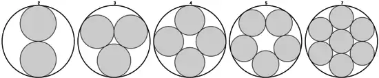 - Rayon et surface des 7 (ou 6) plus grands cercles inscrits (1 cercle au centre entouré de 6) :