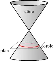 Le cercle est une ellipse dont les foyers sont confondus au centre du cercle ; la longueur du grand axe est égale à la longueur du petit axe. C'est une conique dont l'excentricité e vaut 0. Elle peut être obtenue par l'intersection d'un plan avec un cône de révolution lorsque le plan est perpendiculaire à l'axe de révolution du cône (on parle parfois de « section droite » du cône).