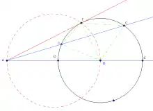 Considérons un cercle de centre O et un point A extérieur à ce cercle. On cherche une tangente à ce cercle passant par A ; le point de tangence est appelé T.