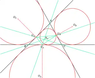Alors les droites (AUA), (BUB) et (CUC) sont concourantes : leur point d'intersection Na s'appelle le point de Nagel du triangle. On appelle le triangle UAUBUC le triangle de Nagel du triangle ABC.