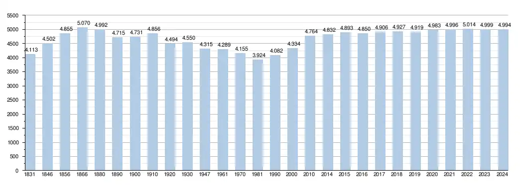 Elle comptait, au , 4 976 habitants (2 498 hommes et 2 478 femmes), soit une densité de 59,64 habitants/km²[3] pour une superficie de 83,44 km².